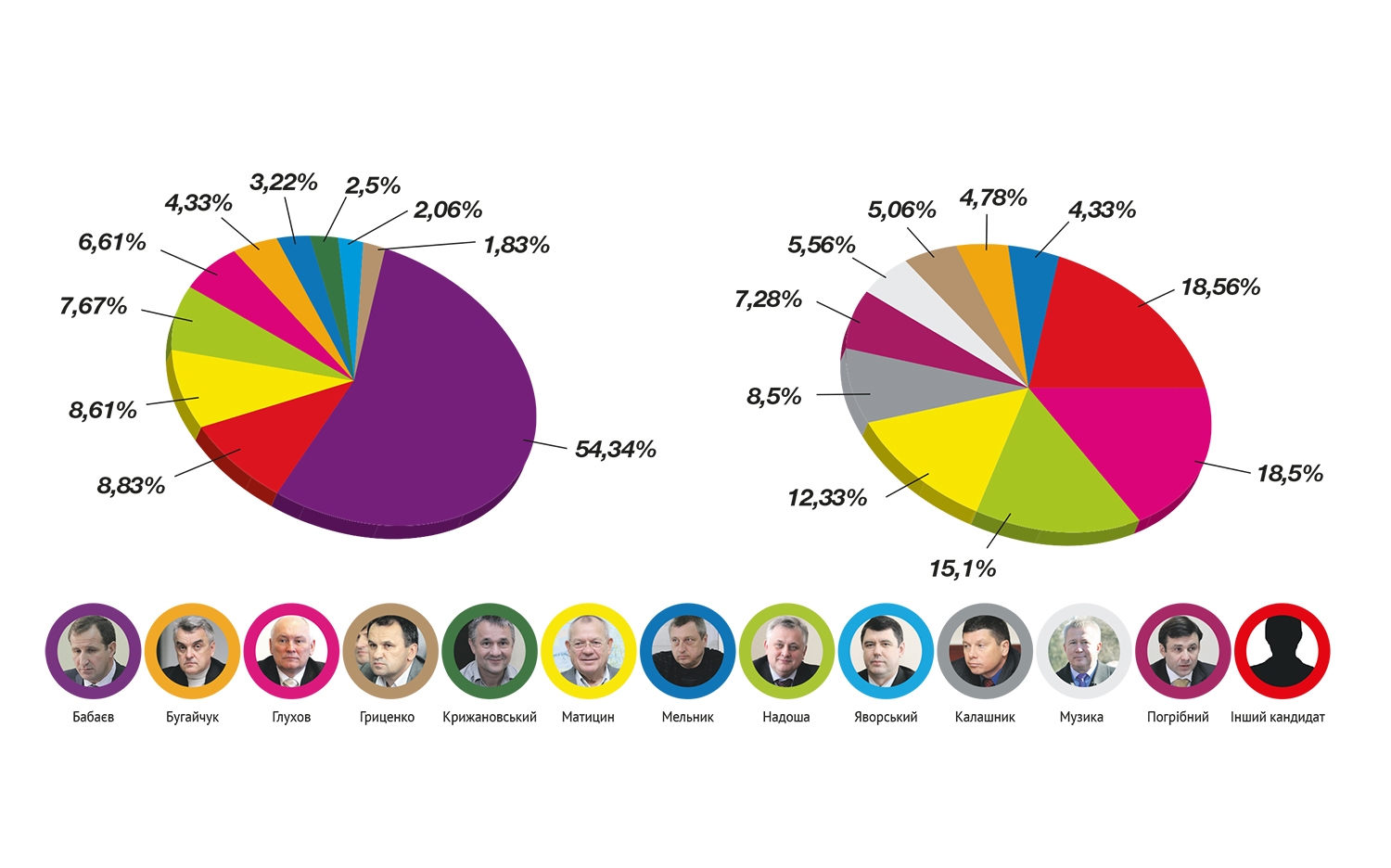 Під час опитування кременчужанам пропонували уявити: сьогодні відбуваються вибори міського голови, вони у кабінці для голосування, перед очима – бюлетень зі списком кандидатів. Так, Олег Бабаєв набрав би 54,34% голосів виборців (перша інфографіка).