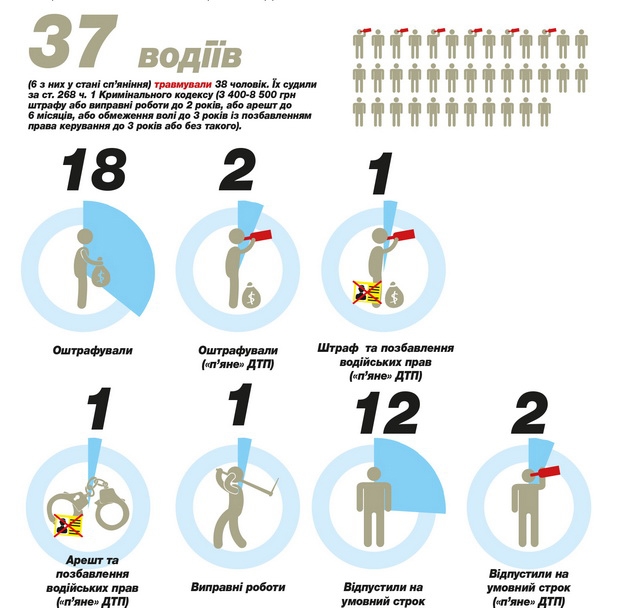 Водії, які спричинили загибель людей, відправляються за грати через одного – іншим дають умовний термін, навіть коли вони були п’яними. Якщо потерпілий не загинув, а був тяжко травмований, в тюрму потрапляє лише кожен четвертий, і кожен третій - серед тих, хто сів за кермо напідпитку. Така собі алкогольна незалежность.