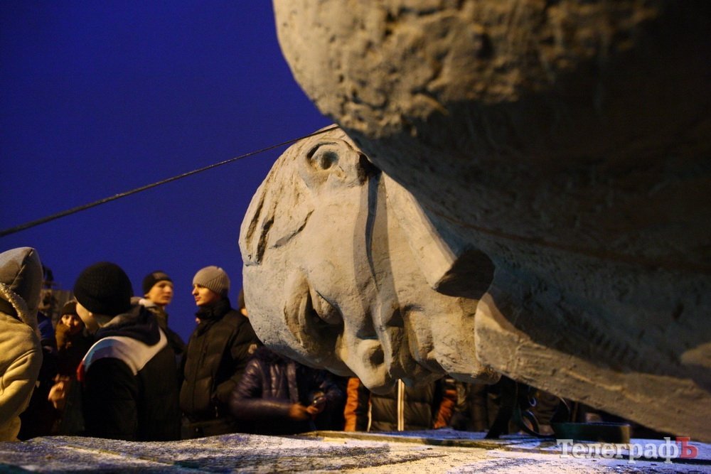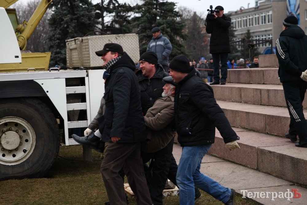 16.12. Люди с болгарками слезли. Памятник поднимают. Люди кричат «Вова, слезай!» и свистят. Памятник планируют снять и погрузить на грузовик Volvo и отвезти в «Благоустройство Кременчуга».