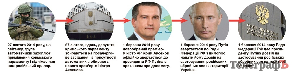 Офіційний Кремль посилається на те, що з проханням про допомогу до президента Путіна 1 березня звернувся новообраний прем’єр-міністр Криму Аксенов. Дійсно, таке звернення «об оказании помощи в деле восстановления стабильности на территории региона» існує. Втім, маємо нагадати, хто такий Аксенов та як він став прем’єром Криму. Сергій Аксенов – голова проросійської партії «Руська єдність». У 2010 році, на виборах до Верховної Ради АР Крим «Руська єдність» набрала 3% голосів виборців. Це дозволило Аксенову та двом його однопартійцям пройти до кримського парламенту. 28 лютого 2014 року Аксенова несподівано обрали прем’єр-міністром АР Крим. Рано-вранці, перед голосуванням, кримський парламент захопила група автоматників. Тож парламентарі голосували за Аксенова в присутності (а, точніше, за участі) автоматників. Дві доби вояк, які захопили кримський парламент, преса називала «військовими без ознак приналежності». На третій день інтервенції їх почали ідентифікувати, як групу військових російського походження. Екс-голова СБУ генерал Марчук назвав їх «військовим спецназом із Севастополя».