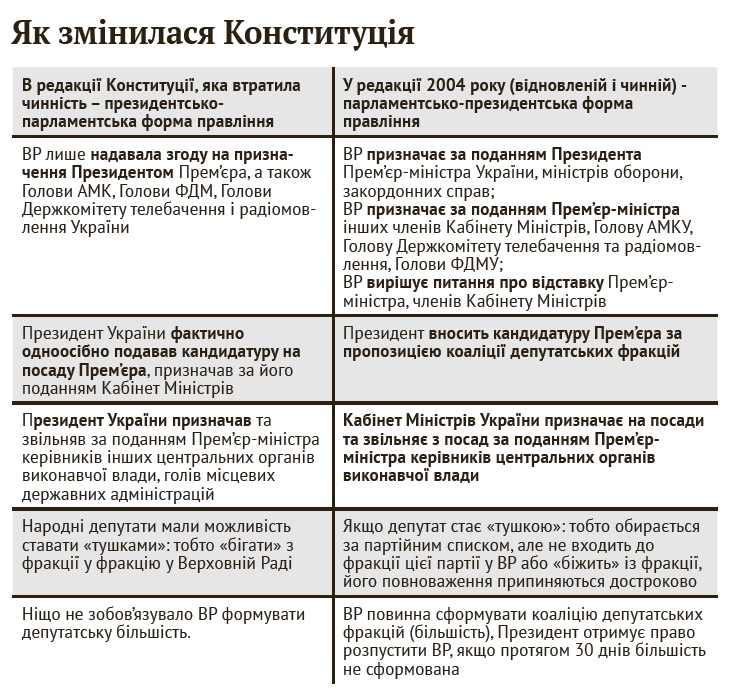 Депутати скасували зміни до Конституції, які діяли з 2010 року та суттєво розширювали повноваження Президента України порівняно з тими, які надавалися при обранні його на посаду. Цікаво, що дані зміни не затверджував парламент – у 2010 році вони були внесені за рішенням Конституційного Суду. І нині Верховна Рада відсторонила суддів КС, які «перебрали» на себе повноваження парламенту, ухвалюючи рішення про зміни до Конституції. У відмінностях двох редакцій Основного Закону (див. таблицю) нам допоміг розібратися політолог Олександр Урін.