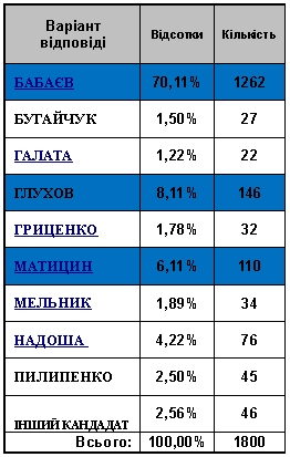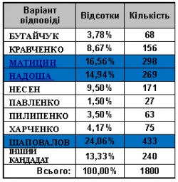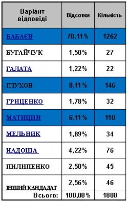 На запитання інтерв`юерів: «Якби вибори міського голови відбулися сьогодні, за якого кандидата Ви проголосуєте?» відповіді респондентів розподілилися наступним чином