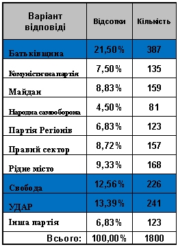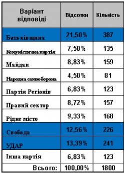 До списку були внесені нові політичні сили, які ймовірно теж будуть виступати суб`єктами на наступних виборах до місцевих ради. Так політична сила «Майдан» має 8,83% прихильників, «Правий сектор» - 8,72%, «Народна самооборона» - 4,50%. Загалом, кількість їх прихильників складає 22,05% виборців, а сукупна кількість прихильників лідерів Кременчуцького майдану (В.Пилипенко, В.Бугайчук, С.Галата) складає всього 5,22% голосів виборців.
