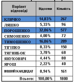 Лідером у цьому рейтингу є П.Порошенко з 32,06 % голосів, другу позицію посідає Ю.Тимошенко – 16,06 %, а третю В.Кличко з 14,83 % голосів відповідно. 8,94 % респондентів віддали б свій голос іншому кандидату, якого не було у списку. Представника Партії Регіонів С.Тігіпка підтримали б 8,33 % виборців; 5,33 % віддають свої симпатії О.Ляшку; 4,44% симпатій виборців залишається у В.Януковича; 4,0 % має лідер КПУ П.Симоненко; 3,78 % - лідер «Свободи» О.Тягнибок та 2,22 % голосів підтримки має Д.Ярош.