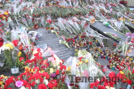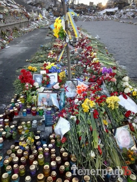 Очень много цветов – и на Майдане, и на Институтской. Цветы лежат у плит с именами погибших украинцев, возле сцены, вдоль всей Институтской – в тех местах, где в дни массовых расстрелов падали раненные и убитые. Из гвоздик и тюльпанов сложены целые стены. Они даже лежат как кирпичи – цветок к цветку. Смотришь, и понимаешь – сюда несли не 100 гвоздик и 50 тюльпанов. Похоже, сюда принесли 700 килограмм гвоздик и килограммов 300 тюльпанов. Их настолько много, что счет идет не на штуки, а на килограммы. Может, здесь лежит центнер цветов. Странно, именно из-за их количества начинаешь понимать, как сильно коснулось киевлян все случившееся на Майдане.
