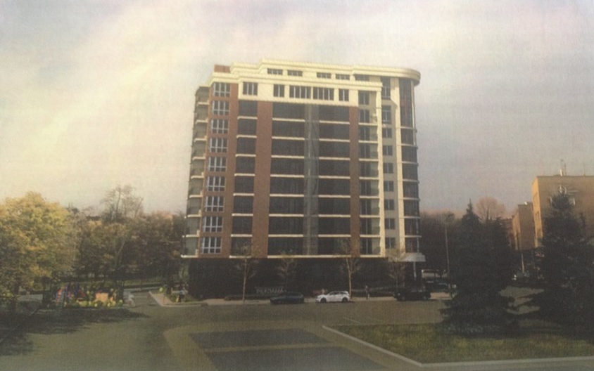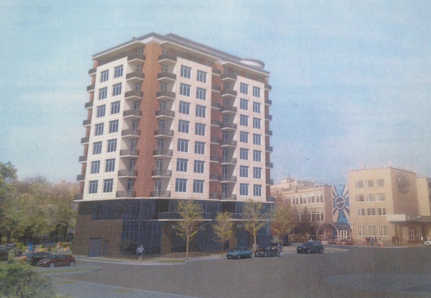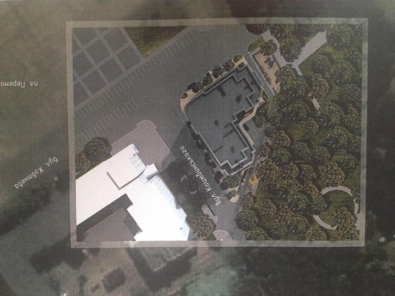 Первый проект здания на площади Победы не утвердили в мэрии и заказчики переделали его, добавив витражные окна, изменив на более округлые формы здания, мансарду и добавили детскую площадку