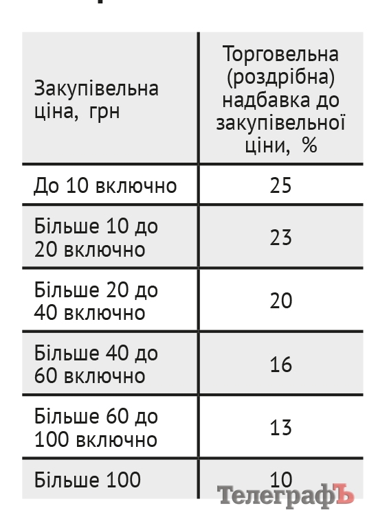 Змінити диференціацію надбавок на ліки і медвироби. Так, раніше регулюванню взагалі не підлягали препарати, ціна на які нижча за 12 грн. На препарати до 100 грн включно нині діє гранична надбавка 25%; від 100 до 300 – 23%; від 300 до 500 – 20%; від 500 до 1000 – 15%, Понад 1000 – 10%. Тепер надбавки фактично пропонується зменшити. Уряд вважає, що це дозволить знизити рівень цін в аптеках у середньому на 17%.