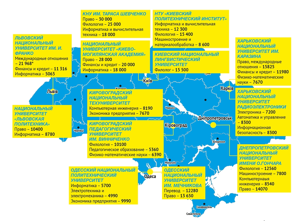 Стоимость одних и тех же специальностей значительно различается в зависимости от города и самого заведения. Например, в Киеве учить на строителя берутся за 20 тыс грн в год, а в Одессе – за 12 тыс грн. Стоимость обучения в вузах Луганской и Донецкой областей мы не мониторили, ведь в самих учебных заведениях не знают, как в этот раз будет проходить прием. Возможно, абитуриенты из этого региона будут поступать в другие регионы.