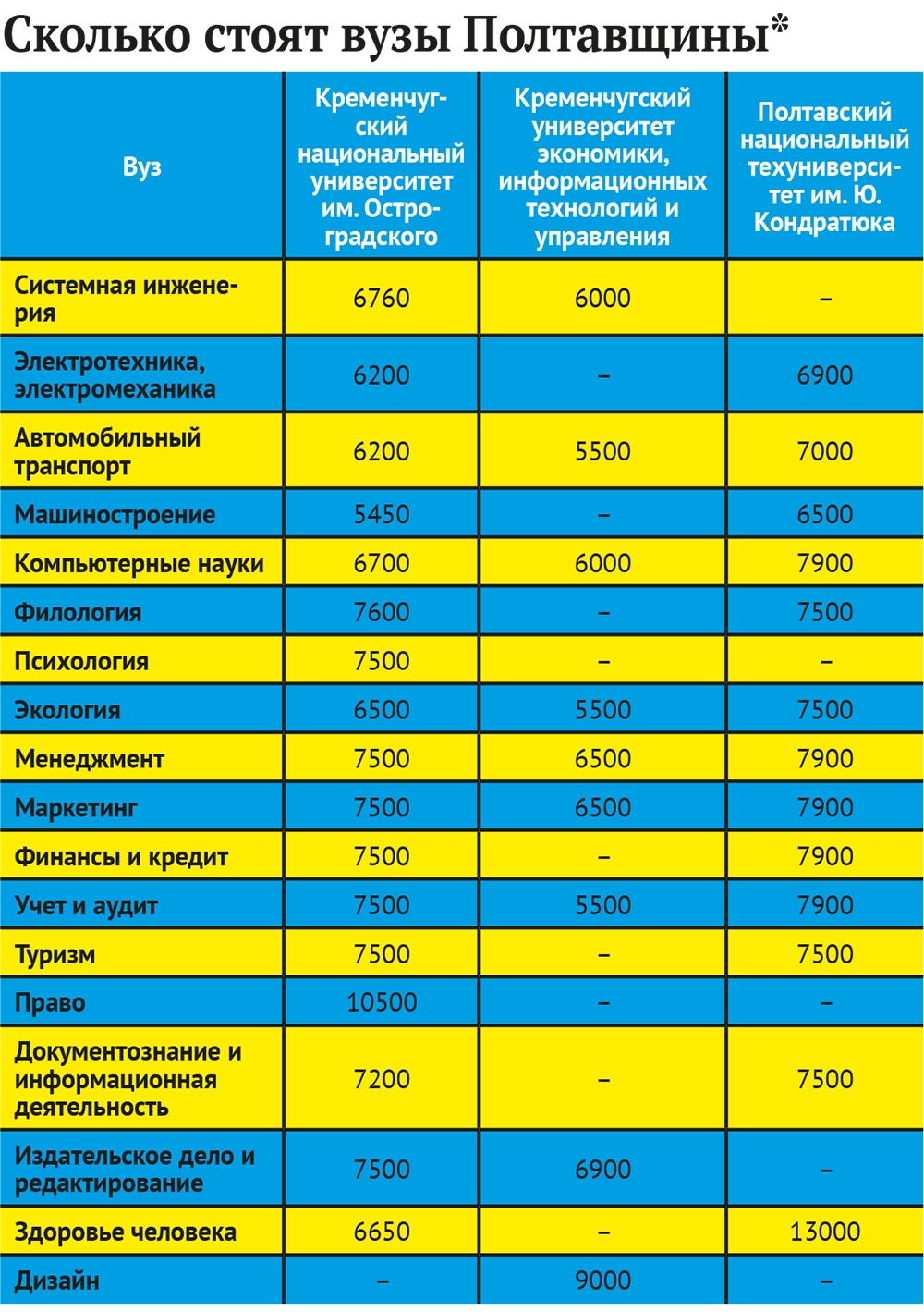 – Кардинального повышения не произошло, – объяснили в приемной комиссии Кременчугского университета экономики, информационных технологий и управления. -На некоторые специальности подняли цены на 30-50 гривень в месяц. Думаю, это не критично. А цены на такие направления, как дизайн, прикладная физика, остались на том же уровне.