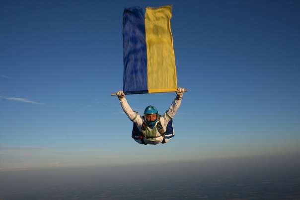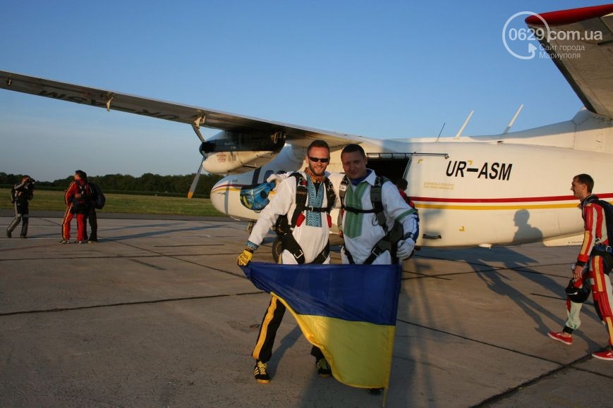 Это произошло на аэродроме "Майское" в Днепропетровской области в субботу, 5 июля. Олег Леукций (на фото - справа) прыгал в вышиванке, летя в свободном падении, он развернул флаг Украины на высоте 4200 метров.