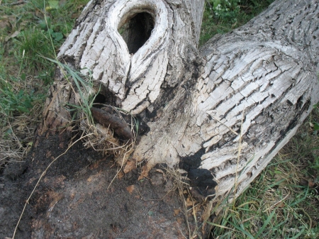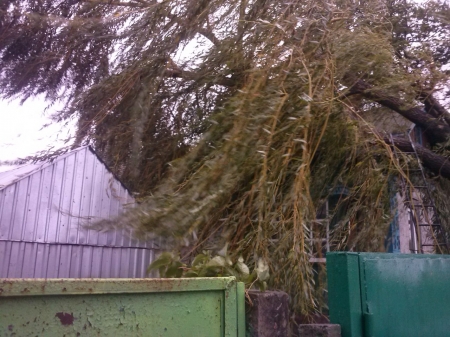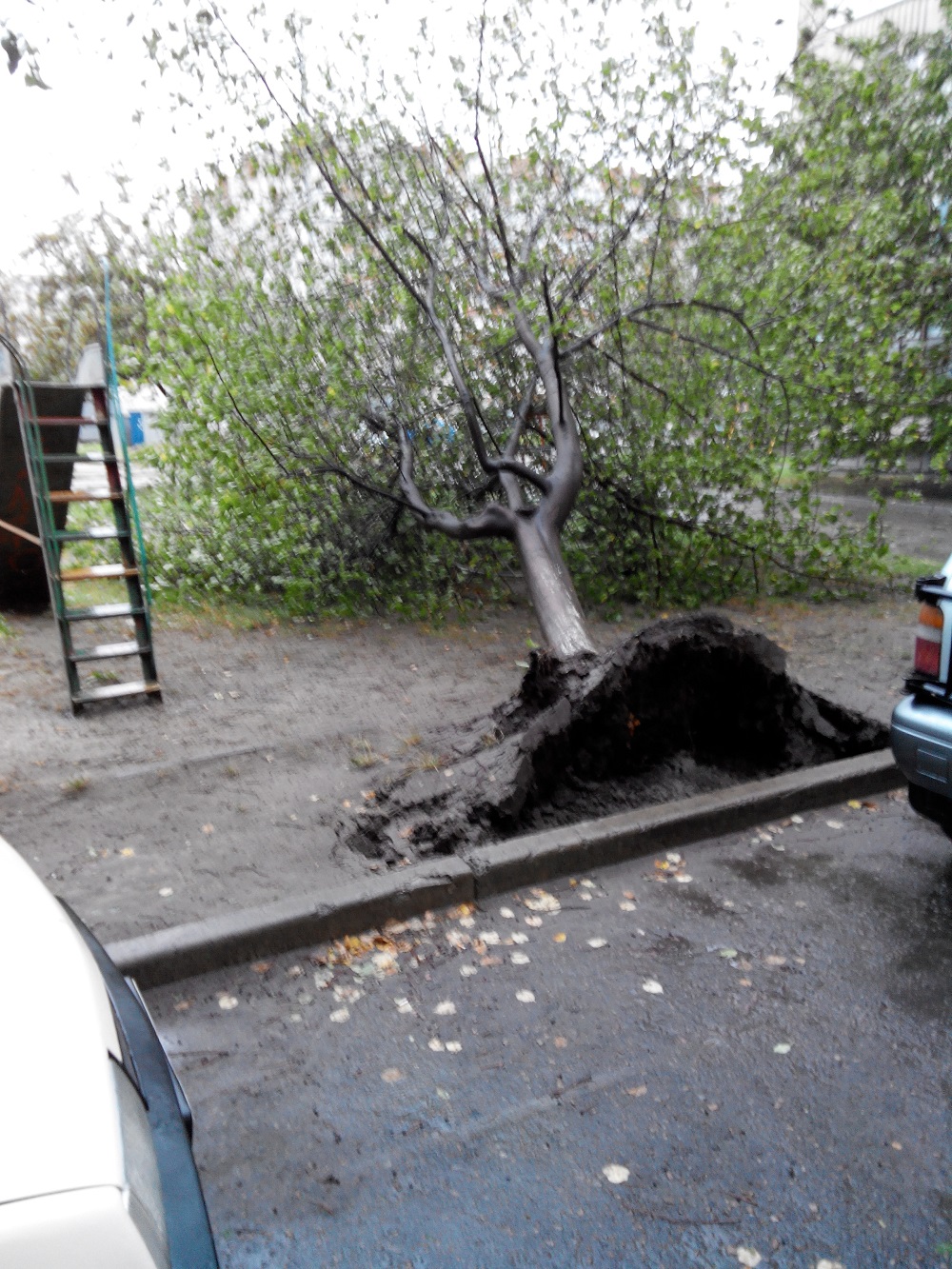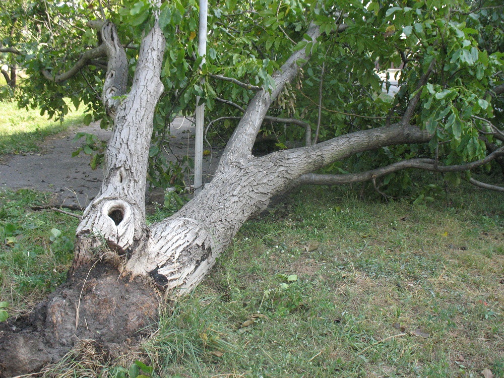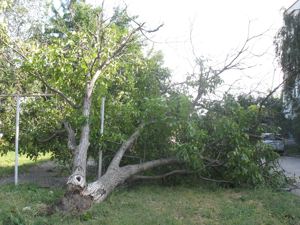 Большой орех во дворе пятиэтажки на Раковке. ул. Ново-Красноармейская, д.31. Фото сделано сегодня, около полудня. Думаю что и сейчас дерево там лежит. При падении орех повредил часть конструкции, на которой сушат бельё (фото - Сергей Брилёв):