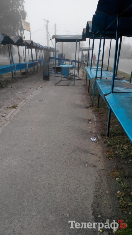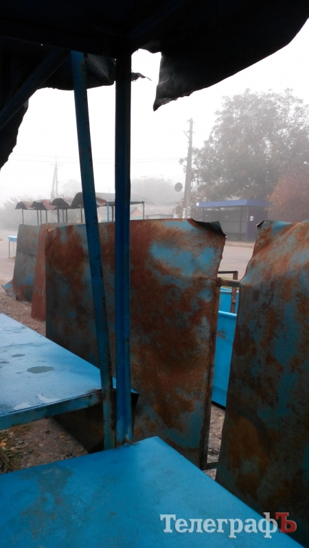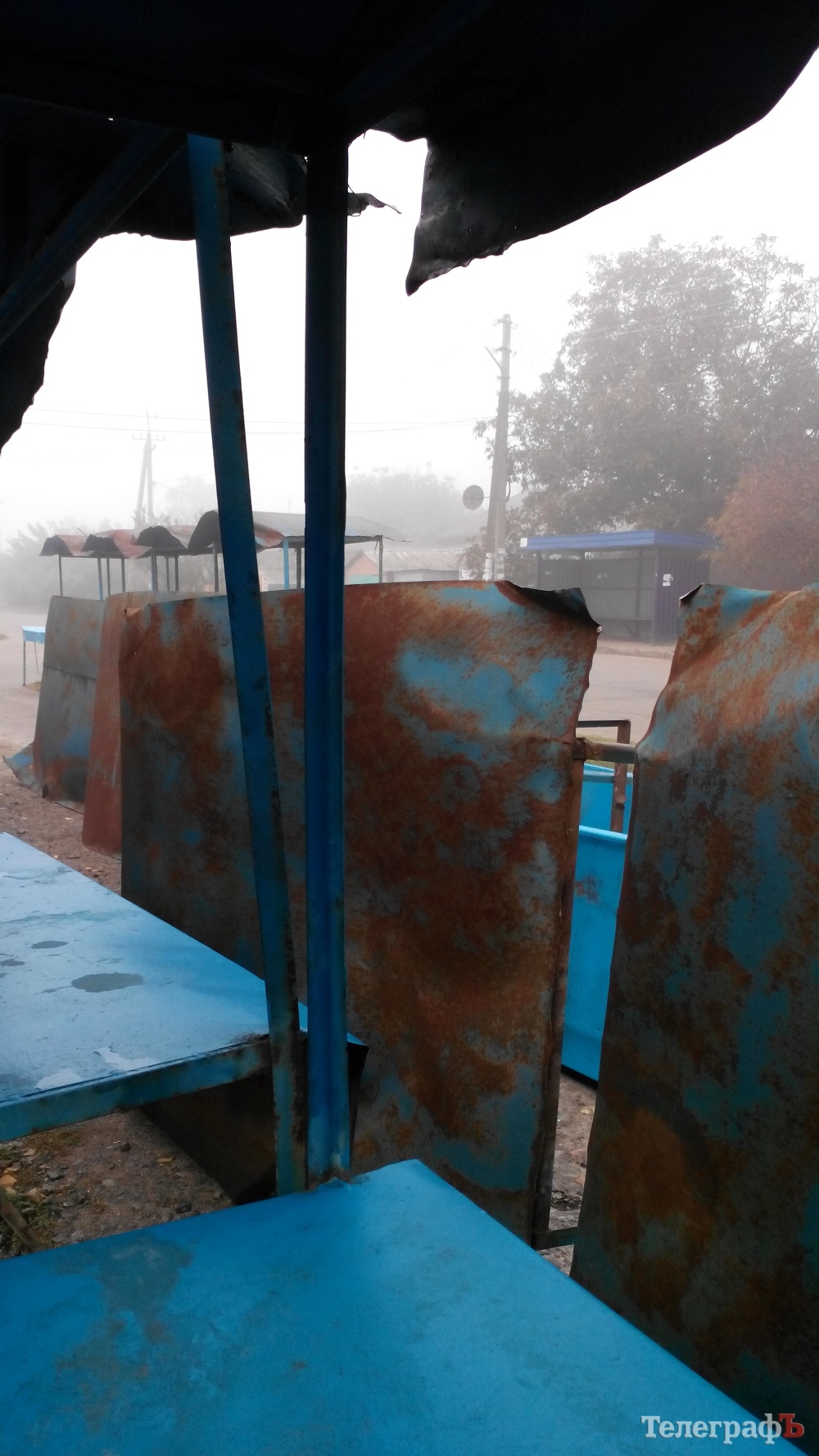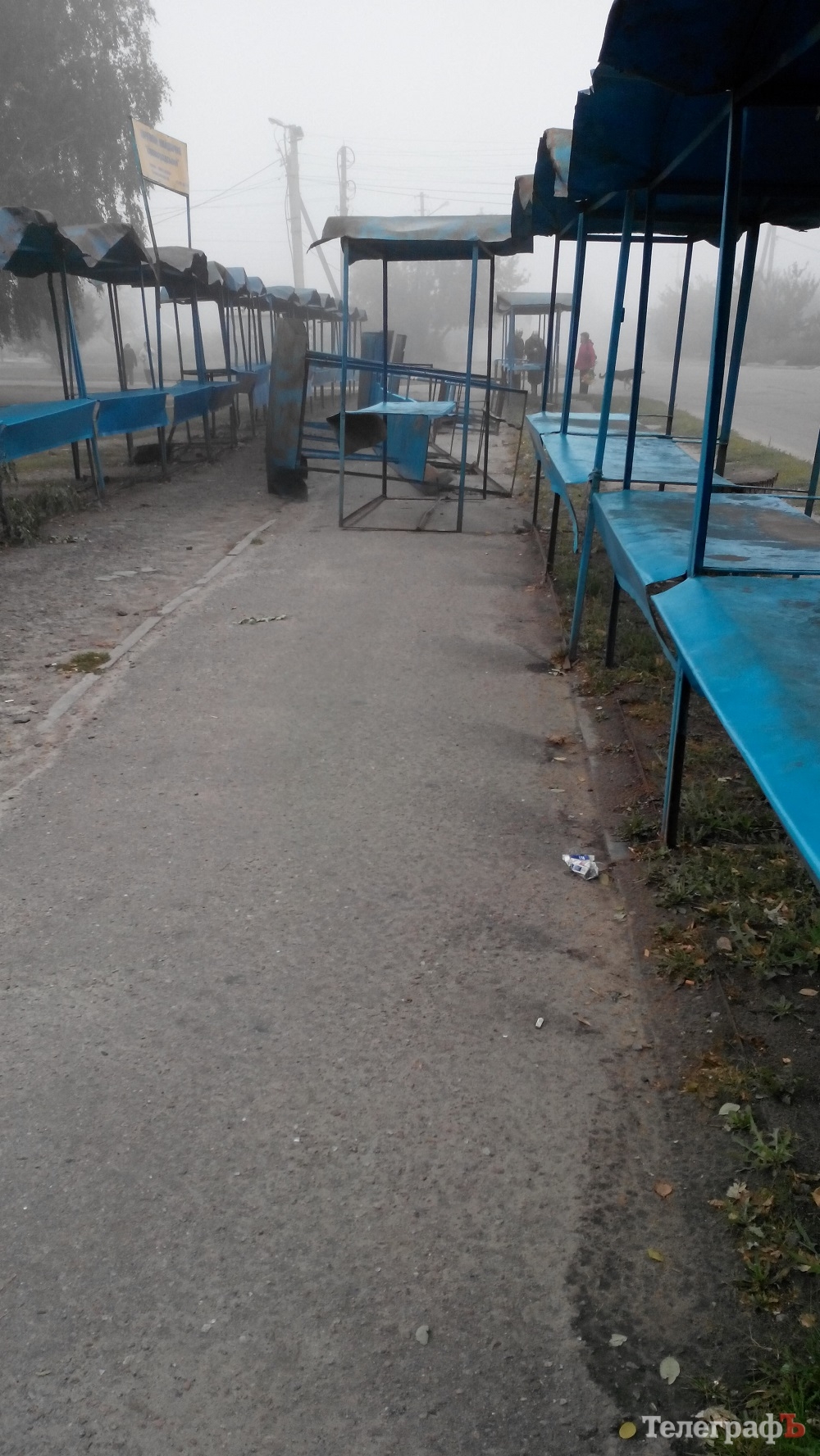 Остановка "Кировоградская" в Крюкове. Мини-рынок: металлические столики с навесами, которые не были закреплены, свалила стихия: