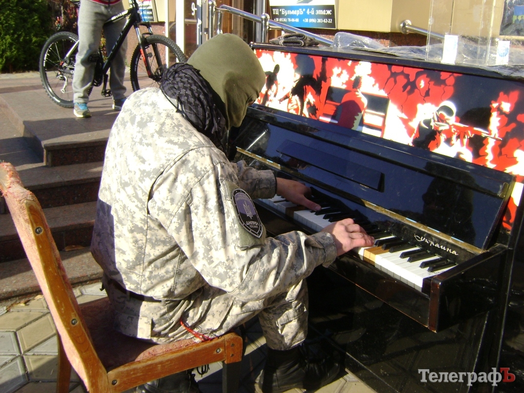 19 октября в Кременчуге побывал пианист-экстремист Богдан. Он стал известен после того, как выступал во время тяжелых событий на Евромайдане в Киеве, неизменно в балаклаве и бронежилете. Ведь он не артист, а защитник Майдана, вспомнивший свои навыки музыканта именно в этих экстремальных условиях. Сейчас Богдан выступает без бронежилета, но в форме и с нашивкой добровольческого батальона МВД «Днепр-1», в котором служит.