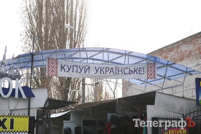 Первым делом в поисках украинских вещей отправляемся на рынок Приднепровский. Ведь именно здесь над центральным входом гордо красуется табличка в национальных цветах «Купуй українське». Сразу же нам встречаются симпатичные шарфики с модными нынче национальными узорами.