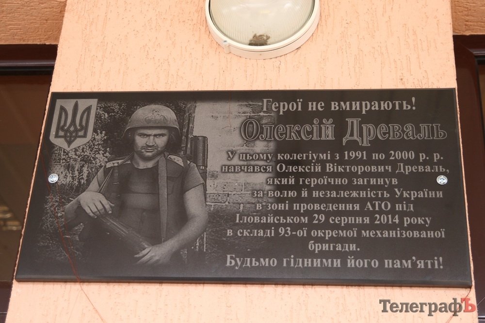 Сегодня в Кременчуге в 12:00 в 25-м коллегиуме открыли мемориальную доску в память о погибшем при выходе из котла под Иловайском Герое Алексее Древале. Алексей учился в этом учебном заведении.