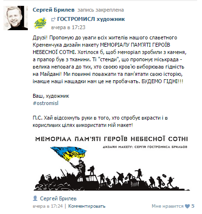 Вчера, 26 марта, на своей странице Вконтакте кременчугский художник Сергей Брилев опубликовал собственный проект Мемориала памяти Небесной Сотни, который собираются установить в Кременчуге.