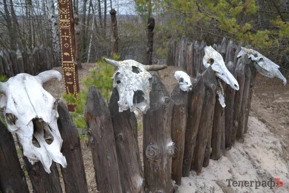 Нам пока что выпала дорога по одной из троп – «Журавлиной». На тропинке, которая проходит вдоль болота, встречается партизанская землянка и бобровый домик в разрезе – бобра там, конечно, нет. А еще есть реконструкция языческого святилища, для устрашения «украшенная» лошадиными черепами.