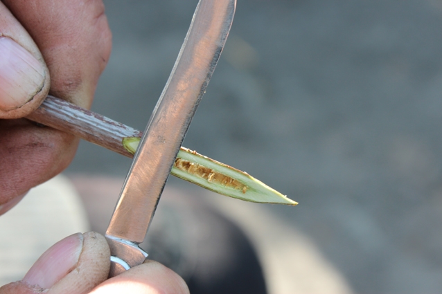 Для цього треба взяти живець, зрізати його кінець з одного боку і з іншого (див. фото). Далі розсікти зрізану гілку, на якій буде прищепа, на глибину заточеного живця. Потім щільно вставляєте живець у цю розщепу, щоб кора була до кори. Причому зрізаний кінець живця повинен трохи визирати зверху. Міцно примотуєте, наприклад ізострічкою, місце прищепи і зверху замотуєте бавовняною мотузочкою.