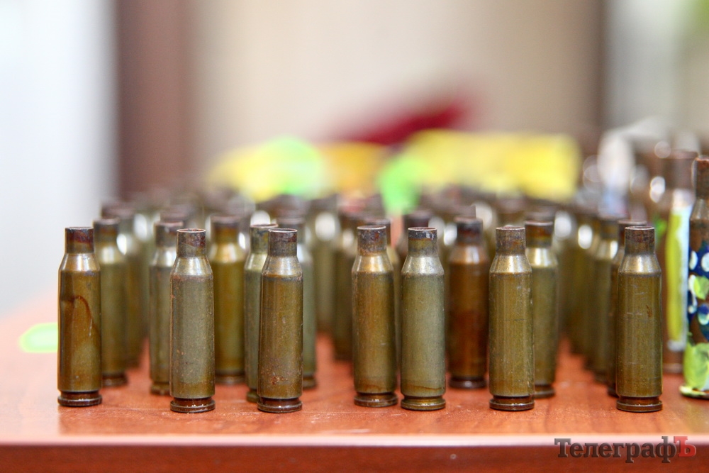 Гильзы от АК-74 с боевых позиций военных в Счастье. Поверх — работа детской художественной школы Оксаны Бойко