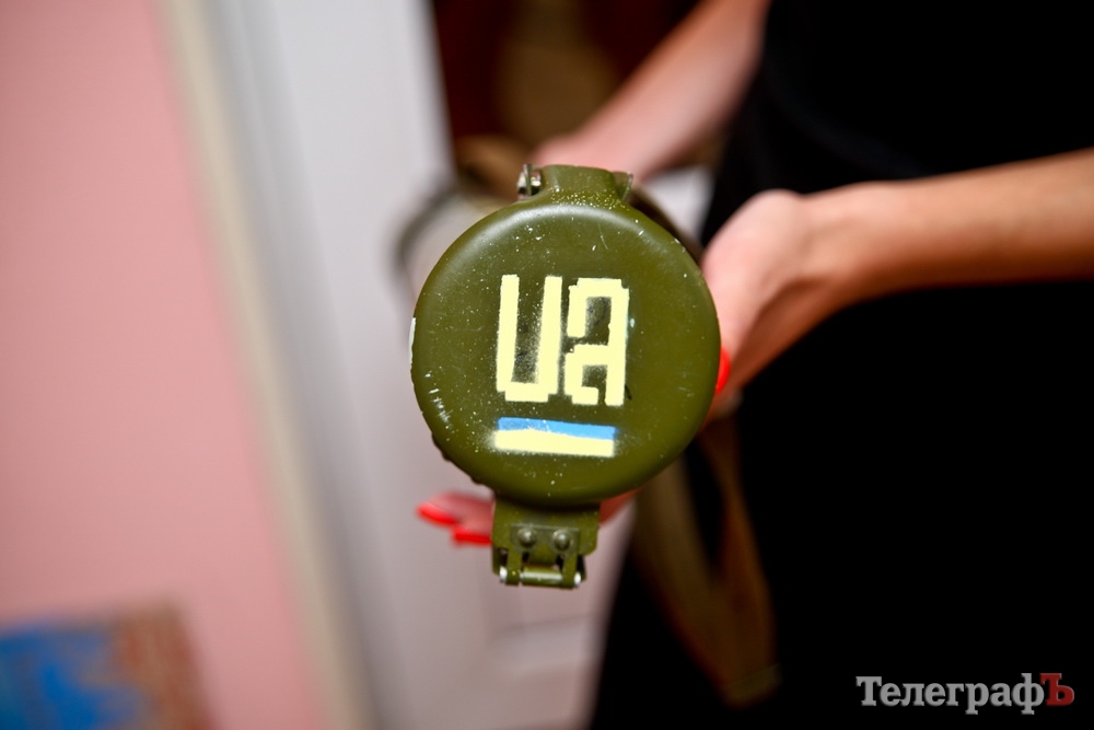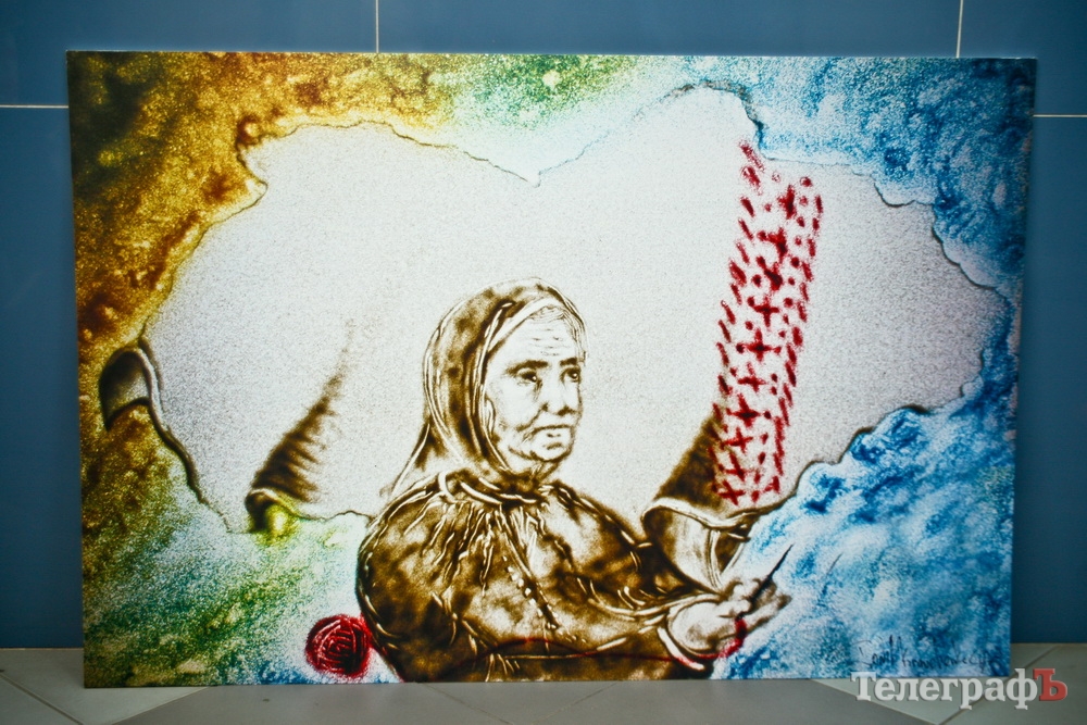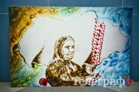 Песочная художница Татьяна Кравченко передала в приемную "Приватной газеты" две картины, а Сергей Брилев создал эксклюзивный трафарет и нанес рисунок на РПГ-22