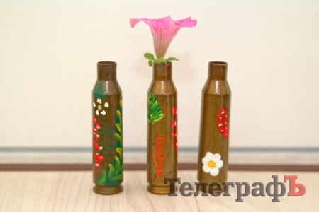 Гильзы от АКМ из Широкино. Поверх — работа детской художественной школы Оксаны Бойко