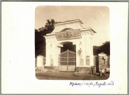 Вход в «Городской сад» до революции 1917 года. Здесь когда-то был разъезд и остановка «Городской сад» трамваев №1 и №2