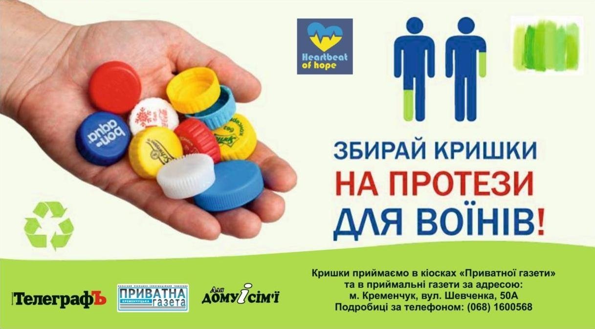 У Кременчуці розпочали збір пластикових кришечок на протези бійцям АТО. Організаторами збору в нашому місті стали Міжнародний благодійний фонд «Пульс надії», пологовий будинок, «Кременчуцький Телеграф», «Приватна газета», які приєдналися до всеукраїнської акції київського благодійного фонду «ОВЕС».