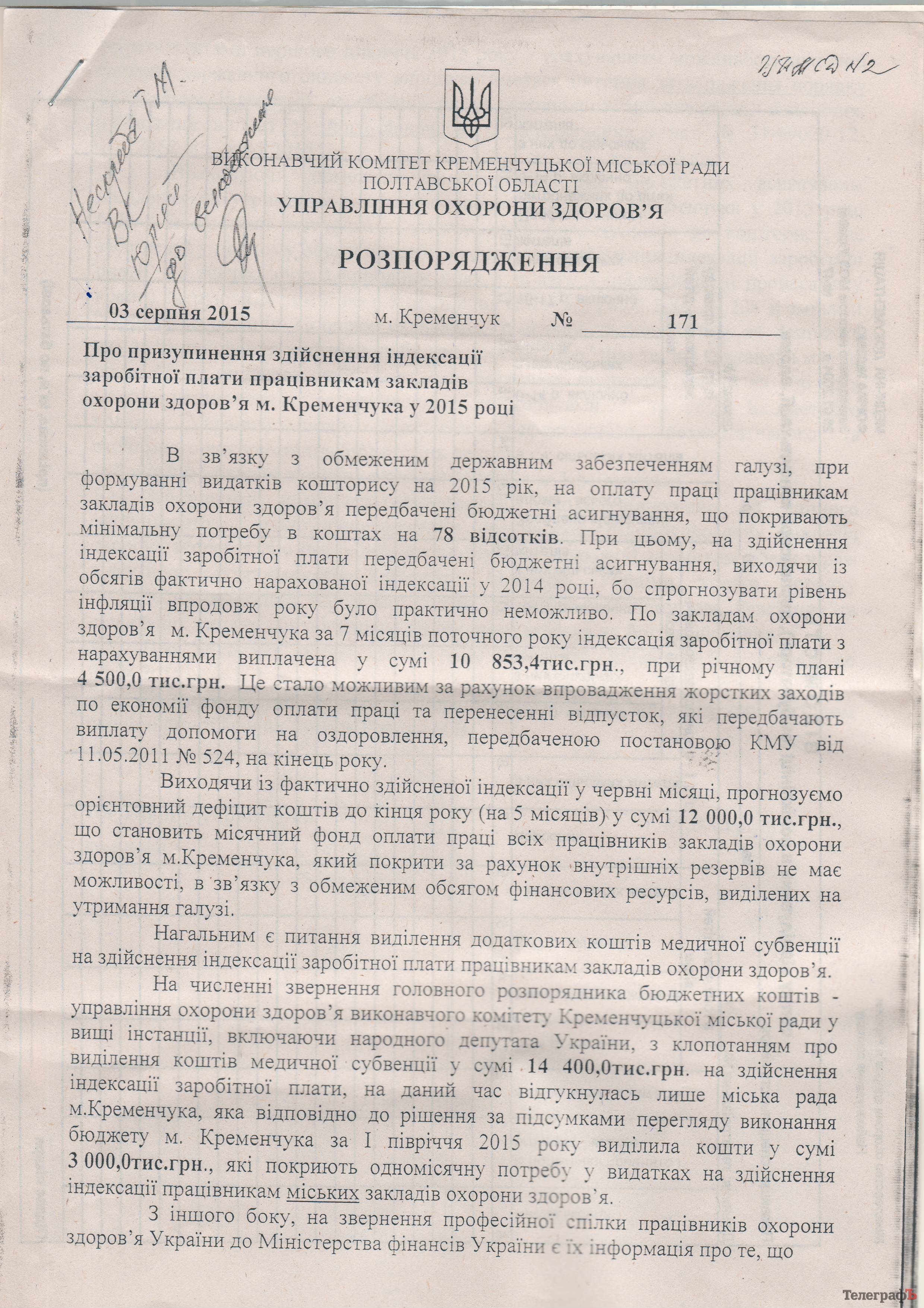 3 августа городское управление охраны здоровья издало распоряжение №171 «О приостановке совершения индексации заработной платы работникам учреждений охраны здоровья г. Кременчуга в 2015 году».