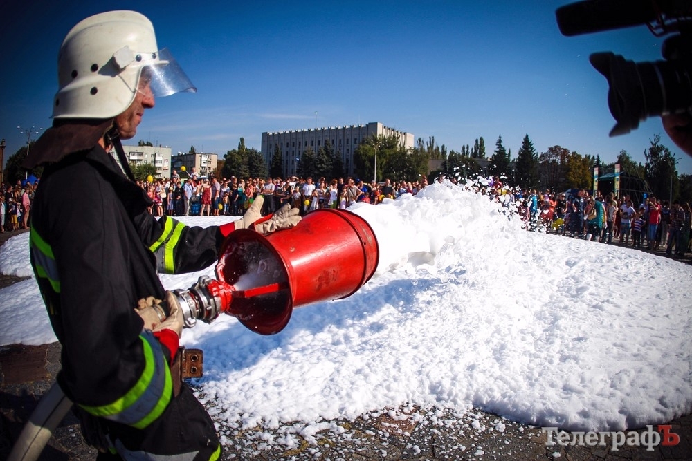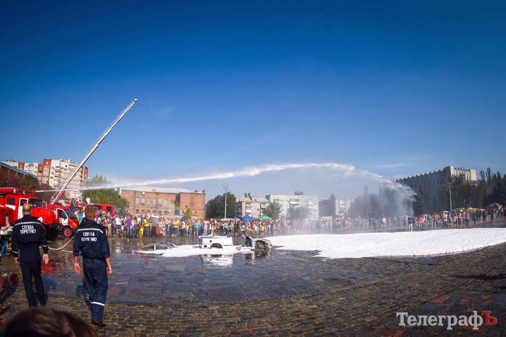 Кременчужанам показали как личный состав борется с горящим автомобилем и спасает водителя. После чего, на радость детям, на площадь было вылито огромное колличество пожарной пены.