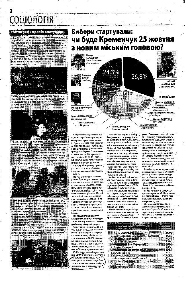 У понеділок, 28 вересня, у під’їздах багатоповерхівок у центральній частині міста розкидали спеціальний випуск газети «Аvтограф». Видання давно присутнє на кременчуцькому ринку, у перервах між виборами реалізується за гроші, під час виборів роздається та розкидається безоплатно.