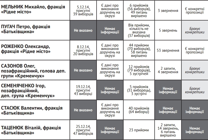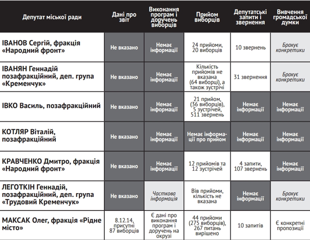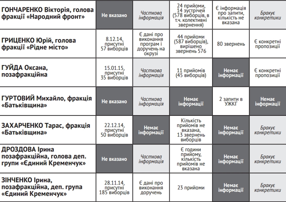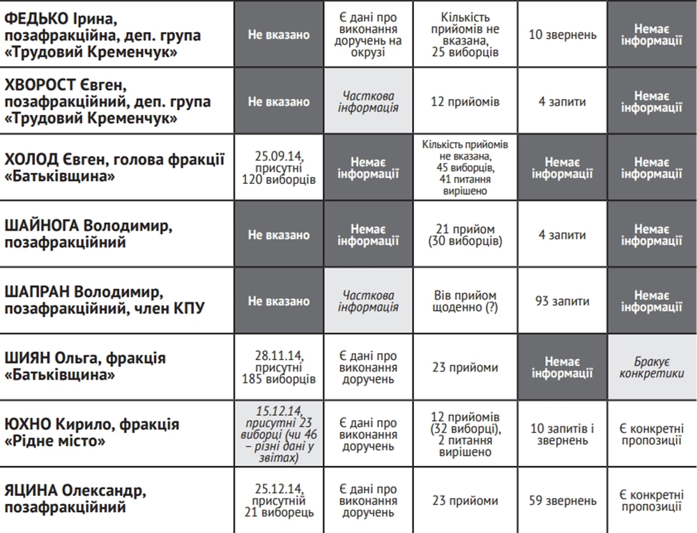 Якщо депутат «білий» у таблиці – це означає, що він сумлінно виконував свої обов’язки (принаймні, судячи зі звіту). Тобто його звіт містить конкретні дані про проблеми виборців на окрузі, про їхні потреби та шляхи виконання (депутатські звернення, запити, участь у формуванні місцевих програм).