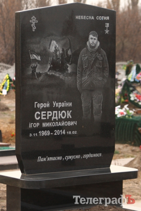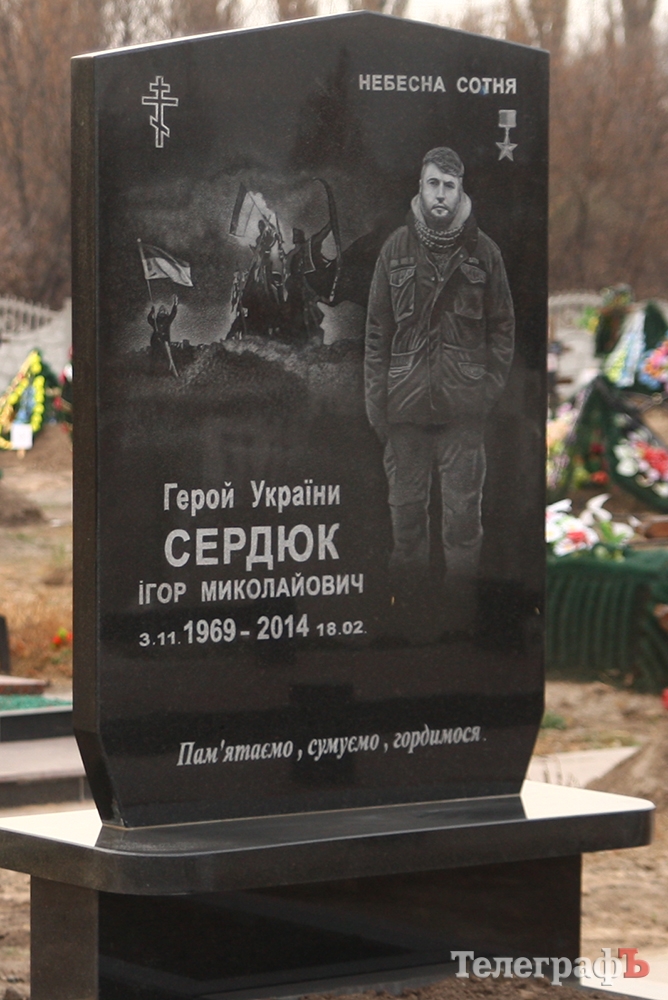 Герою України Ігорю Сердюку сьогодні мало виповнитися 46 років. На могилі Героя Небесної Сотні кілька днів тому встановили пам’ятник. Майже півтора роки не могли встановити надгробок. Дружина Ігоря Ірина Сердюк розповіла, що ескізом пам'ятника займалися у Харкові, тому процес трохи затягнувся.