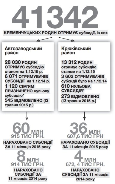 За сумарними даними управлінь праці та соцзахисту Автозаводського та Крюківського районів станом на 1 грудня, 41 342 кременчуцькі родини вже користуються субсидіями (більш детально – в інфографіці). Якщо врахувати, що у місті 224 тисячі мешканців, а в середньому родина складається з трьох осіб, то виходить, що субсидію отримує практично кожна друга кременчуцька сім’я. Кількість тих, хто отримує цей вид допомоги, збільшилася у 4,2 раза порівняно з 2014 роком.
