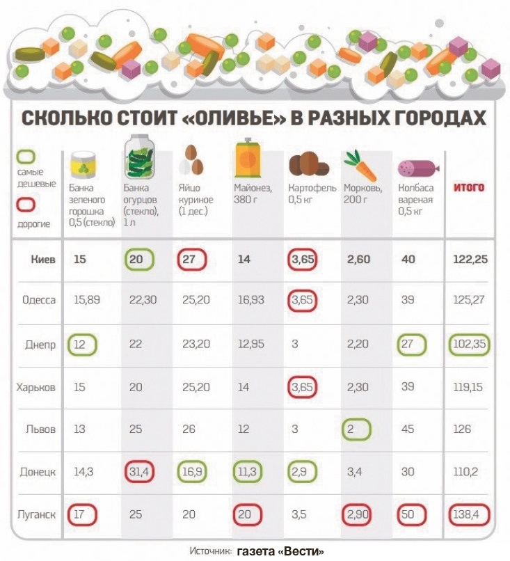 Кстати, наши коллеги из газеты «Вести» прикидывали стоимость оливье в разных регионах Украины. Оказалось, в разных городах цена на набор для салата – разная. Это зависит от развития торговых сетей в городах: чем их меньше в городе, тем выше цены. Специалисты отмечают, что колбаса в среднем выросла в цене на 22%, овощи – в два-три раза. Причина – затраты на их выращивание (удобрение, топливо). Та же проблема с яйцами – цены на корма для птицы тоже выросли в несколько раз.