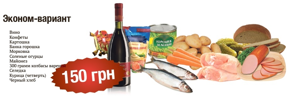 И еще отдельно решили упомянуть набор «мини», для тех, кто не собирается особо праздновать: бутылка шампанского и конфеты. Даже это затянуло минимум на 70 грн. Вариант скромного ужина – это уже с бутылкой вина, так как оно всего дешевле: от 28 грн. Всего в экономной программе представлены картошка пюре с селедкой, курица (четверти, они подешевле), стандартное оливье, конфеты. Ну и разносолы из погребов, которыми всегда богаты хозяйки со средним достатком.