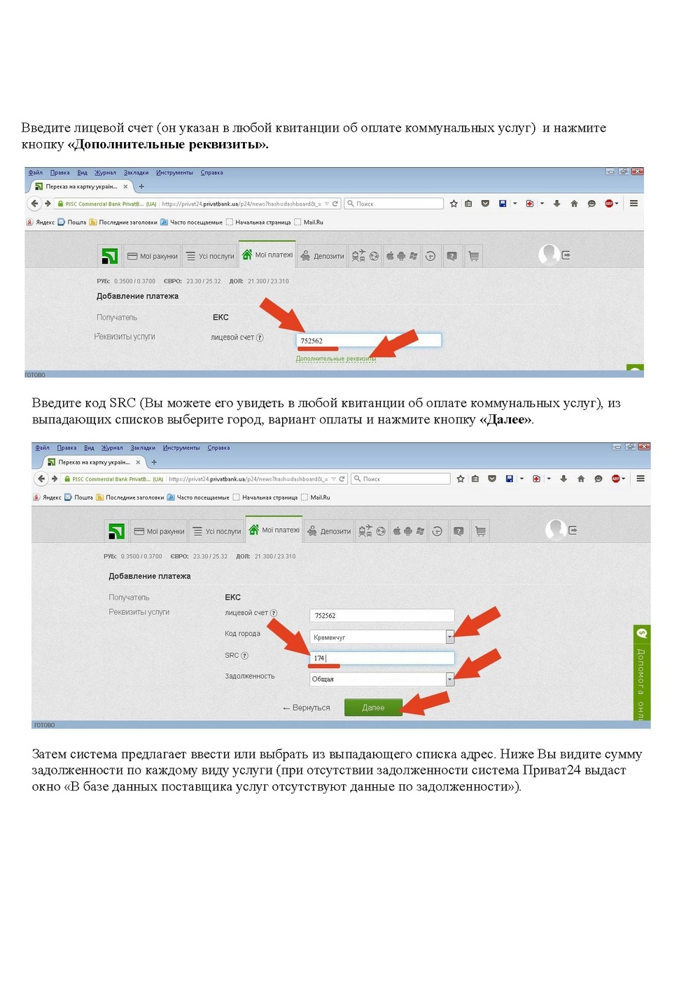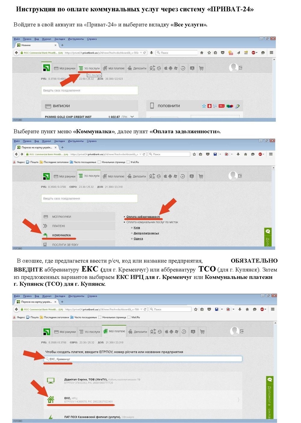 Зайдите в Приват24, выберите «все услуги – коммуналка– оплата задолженности» (1,2). В появившемся окне введите ЕКС, Кременчуг (3). Вам предложат несколько вариантов. Выбираем ЕКС ИРЦ (в этом случае у меня был технический сбой) или ЕКС (ТСО) (в этом случае все прошло успешно). Осталось указать личный счет, который вы найдёте на квитанциях (4). Нажать кнопку «дополнительные реквизиты» и указать SRC (есть в квитанциях) (5). Дальше указываете свой адрес и все почти готово: высвечиваются ваши долги по коммуналке, по каждому из пунктов – свет, вода газ и т. п (6). Можно переходить к оплате, комиссия за операцию не взимается (7,8). Квитанцию нужно оплатить «тютелька в тютельку» – частичная оплата не предусмотрена. Хотите оплачивать частично: ищите по такому же принципу каждое предприятие отдельно и перечисляйте им деньги. Но в таком случае по каждому предприятию комиссия 1 грн. Из полезных функций в Приват 24 – возможность настройки и автоматической оплаты: банк будет ежемесячно автоматически снимать с карты деньги за коммуналку, присылая вам SMS.