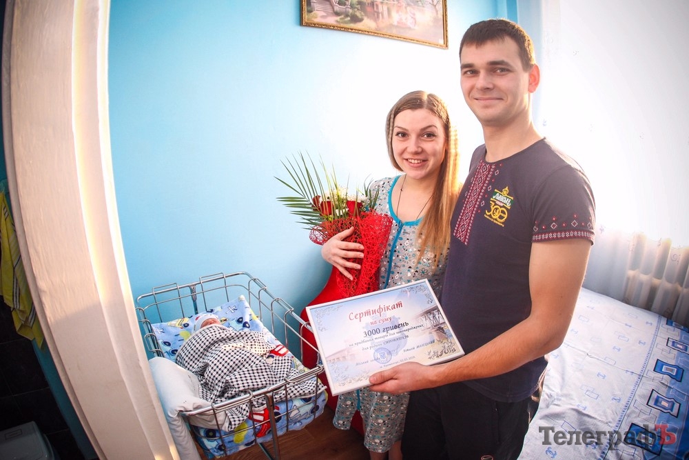 Першому кременчужанину у новому році мер Віталій Малецький подарував сертифікат на 5000 грн. Всім іншим породіллям мер вручив сертифікат на 3000 грн.