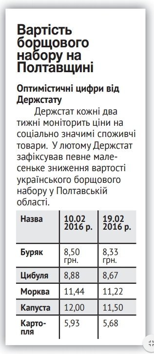Держстат кожні два тижні моніторить ціни на соціально значимі споживчі товари. У лютому Держстат зафіксував певне малесеньке зниження вартості українського борщового набору у Полтавській області.