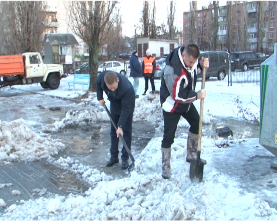Мер під прицілами відеокамер своїми руками розчищає сніг на майданчику для сміття на Автокразівському бульварі.
