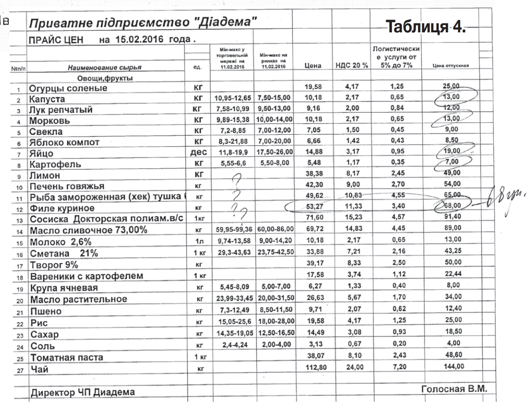 «ТелеграфЪ» отримав від департаменту освіти прайси ПП «Діадема» (таблиця 4). Ви теж можете побачити, як формується ціна. Ось вони закуповують капусту по 10,18 грн., додають 20% ПДВ (2,17 грн.), потім ще 0,65 грн. на логістику і капуста в них виходить по 13 гривень. Ще більше враження справляють операції з курячим філе. Купують по 53,27 грн., плюс 11,33 грн. (ПДВ), плюс 3,40 грн. (логістика) і в шкільні їдальні простеньке філе приїжджає вже по 68 гривень.