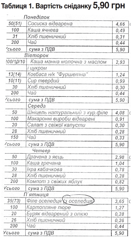Сума мізерна. Тож і виглядає шкільний сніданок дуже скромно (див. таблицю 1). Про вітамінізацію, свіжі фрукти, достатню кількість клітковини та корисні кисло-молочні продукти годі й мріяти.