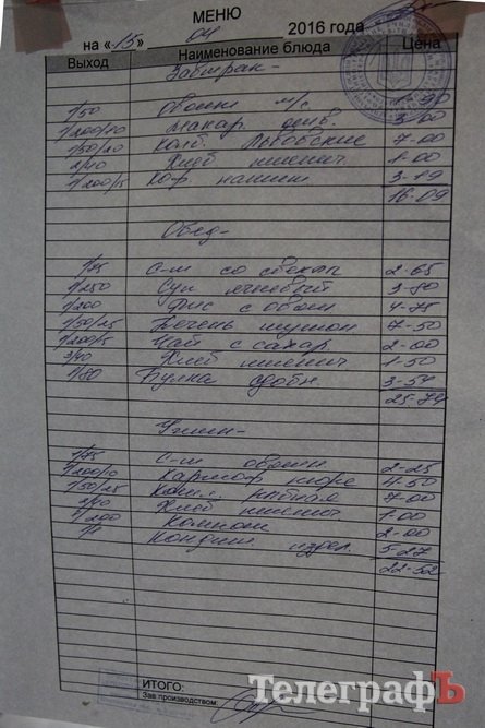 Виявилось, що рибна котлета вагою 50 грамів (плюс 25 г підливи) коштує для сироти 7 гривень. Для порівняння: у стандартному меню для кременчуцьких шкіл шніцель рибний натуральний вагою 50г коштує 4,15 грн.; січеники м’ясо-рибні (50г) – 4,15 грн.; котлета, наприклад, з яловичини (50г) – 3,99 г.