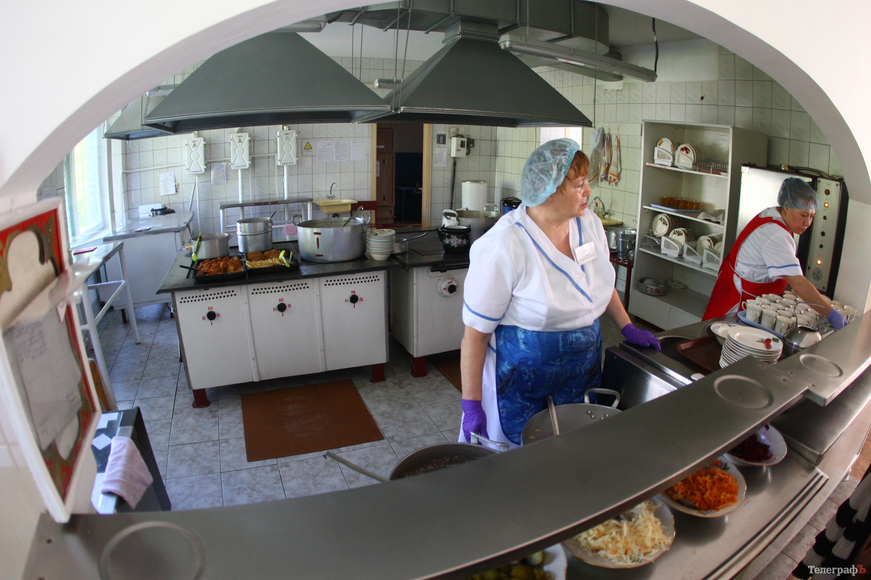 Кухня досить простора. Має потужну витяжку. Кондиціонеру немає, замість нього – відчинені вікна. Працівники кухні кажуть, що їм нормально, не жарко, втім зовнішній вигляд видає, що таки спекотно.
