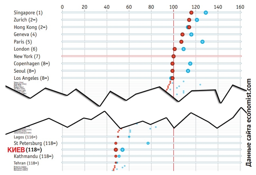 Британский таблоид The Еconomist недавно опубликовал свой рейтинг стоимости жизни в разных городах мира. В него вошел Киев. Находится он в хвосте списка, но за ним с дюжину городов мира. Например, таких, как Алжир, столица Замбии или иракский Тегеран. Слетели в рейтинге вниз не только мы. Киев по своим ценам следует сразу за Санкт-Петербургом. Создатели рейтинга отметили, что и Москва, и Санкт-Петербург резко упали, показав снижение стоимости жизни (в долларах) на 40%.