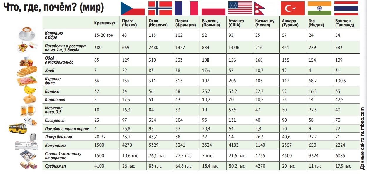 После того, как курс гривни решил пикировать вниз, у нас все стало очень дешево. Но для иностранцев. Они пишут восторженные посты уже не только о потрясающих девочках в коротких юбках, но и о потрясающих ценах. Для приезжих здесь все шокирующе дешево. Для украинца теперь все наоборот. Куда бы ни поехал – везде дорого. Если раньше бытовало мнение, что где-нибудь в Индии 100 долларов на месяц хватит за глаза, то теперь это разве что на каремате у Ганга. И те, кто еще пару лет назад мог пожить зимою в теплых странах, ибо это было дешевле, чем арендовать жилье, теперь лишились такого удовольствия. Как выглядят сейчас наши цены на фоне остальных? На что хватит зарплаты кременчужанина в какой-нибудь другой стране? И где сейчас дешевле, чем у нас?