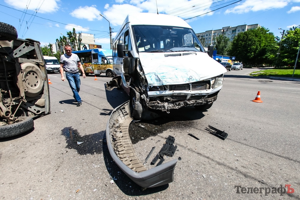 Около 11.30 на Молодежном (перекресток пр-та Леси Украинки и ул. Воинов-интернационалистов) произошло ДТП - маршрутка врезалась в поворачивающий Volkswagen Transporter. После столкновения Volkswagen перевернуло и отбросило на обочину.