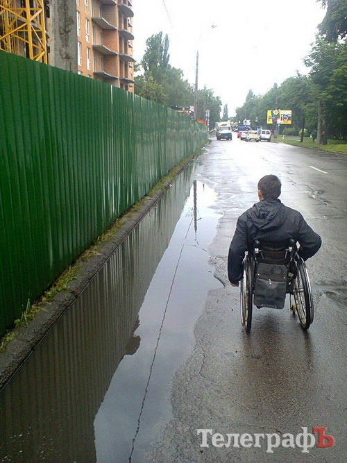 Костянтин Кууск на візку намагається проїхати по вулиці Троїцькій, поруч із будівництвом. Де мають ходити люди, нікого не обходить. Забудовник пропонує кременчужанам трохи екстриму: прогулянку проїжджою частиною. Адже місця для пішоходів просто не передбачили, а міська влада на це закрила очі.
