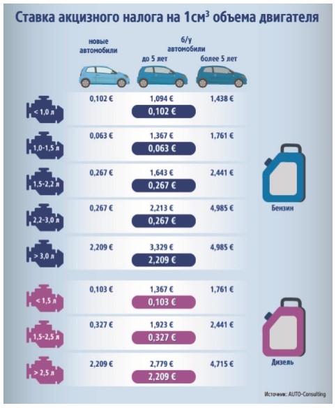 – Тепер акциз на б/у автомобілі становить символічні 100 євро на авто з об'ємом двигуна до 1 л замість колишніх 1 436 євро (зниження в 14 разів), – зазначають у консалтинговій компанії.