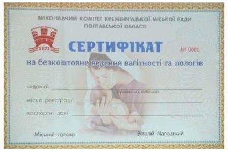 С 15 августа в Кременчуге запущена программа «Родовых сертификатов», которые должны искоренить в роддоме практику «добровольных взносов». По заявлениям начальника городского управления охраны здоровья Максима Середы, а также мэра города Виталия Малецкого, родовой сертификат с 15 августа получают зарегистрированные в Кременчуге женщины, которые становятся на учёт по беременности в женских консультациях, а также те, кто рожает. Те, кто стал на учёт до 15 августа и ещё не рожают, получат сертификат при очередном плановом посещении женской консультации.