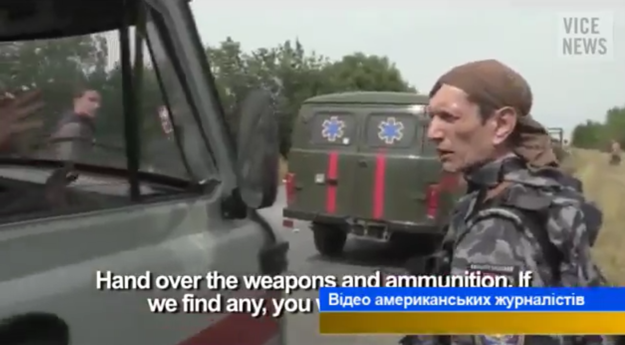 Олександр: А я спілкувався з ними. Раніше працював у міліції, мав офіцерську посаду та мав досвід спілкуватися з особовим складом. Я був на чолі колони, яка вивозила поранених хлопців, які стікали кров’ю. Рани заражені, з медикаментів лише перев’язка. Був випадок коли ми в районі обіду виїхали на бугор з пораненими. Спека неймовірна. А ці москалі на БТРах заблокували колону спереду та позаду.